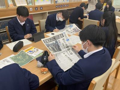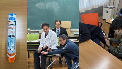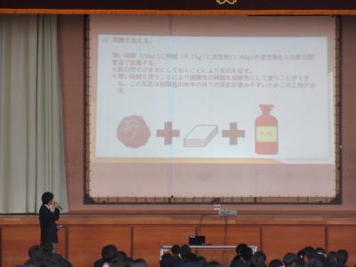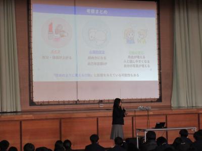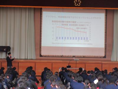 代表の3年生がカメラの前で、自身の経験を堂々とした態度で発表しました。その様子は各教室へリアルタイムで配信され、1年生はメモを取りながら、先輩たちの言葉一つひとつに真剣に耳を傾けていました。